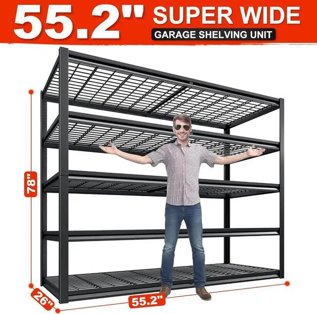 There is no nuts or bolts required, you can quickly assemble every stand alone sturdy shelves for storage within 10 minutes alonefalse- 78"H x 55.2 "W x 26" D Wide Storage Shelves heavy dutyThe garage shelving heavy duty is suitable for garage, warehouse, basement, warehouse, Library, etc. The 5 tier metal shelves for storage not only expands your storage space, makes your home clean and orderly