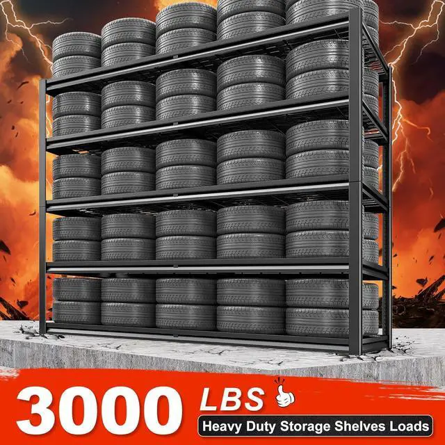 - 3000LBS Capacity Heavy Duty Garage Storage ShelvesREIBII heavy duty shelving unit has thickened double metal legs. Made of high-quality metal, each solid thickened metal shelving with 8 big ribs beneath can hold up to 600 lbs, with a total bearing capacity of 3000 lbs, which makes industrial garage shelves heavy duty more stable and solid than normal metal shelves for storage, and more stuff can be stored