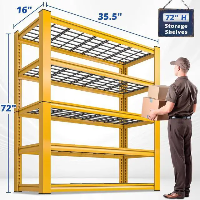 - 72"H* 35.5"W *16"D Garage ShelvingStorage shelves provide sufficient storage space and holds tons of items. This metal shelves can hold at least 3 regular sized 20 gallon storage containers, making your space organized even more. The garage shelves heavy duty is also suitable for many places, garage, basement, warehouse, kitchen, etc. The optimal choice for your house