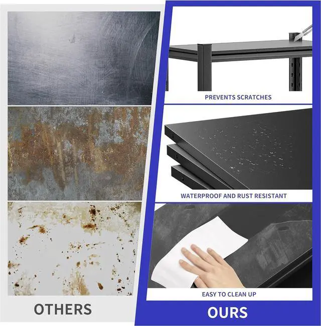 - RUST-PROOF, SCRATCH-PROOF, EASY-TO-CLEAN HEAVY DUTY SHELFThe garage shelving is treated with anti-rust spray paint, the metal material and special surface treatment can prevent the rust problem caused by the humid environment; the smooth metal surface design makes this shelf very easy to clean and take care of daily. Each shelf is equipped with protective pads to protect floors from damag