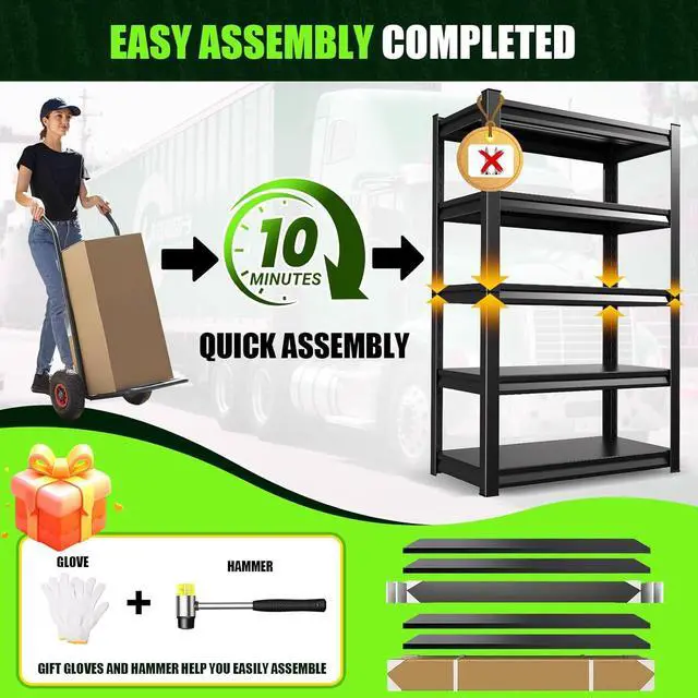 Easy Assembly: The multifunctional storage shelves features a gourd-shaped slotted interlocking design, unlike bulky structures that require screws to assemble. This shelf can be assembled by simply aligning the components and then snapping them into place. The assembled shelves have no gaps, so you don't need to worry about deformation of the connection parts. We provide a detailed installation tutorial with clear step-by-step instructions for each component, making assembly a breeze. In just a few minutes, you can have a high capacity garage storage shelves5.