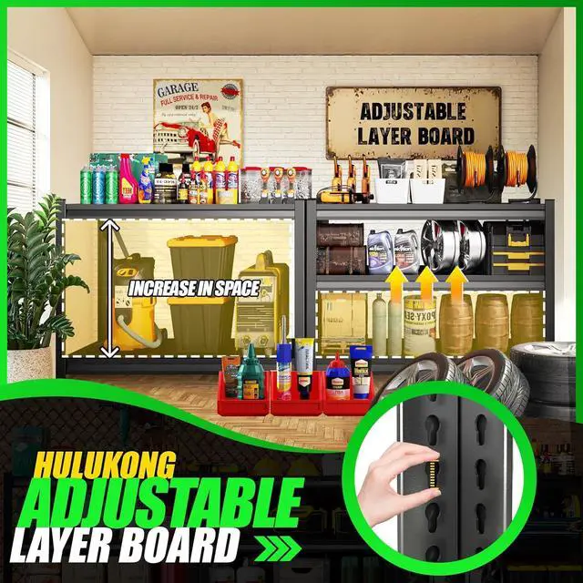 Height Adjustable: Each level of this heavy duty garage shelving is height adjustable, whether it's large machine tools, spare tires, or small parts, the space can be adjusted according to your needs, maximizing the utilization of shelf space. You no longer need to place large items and agonize over them, nor do you have to worry about wasting space for small items, it is easy to create the perfect storage solution4.