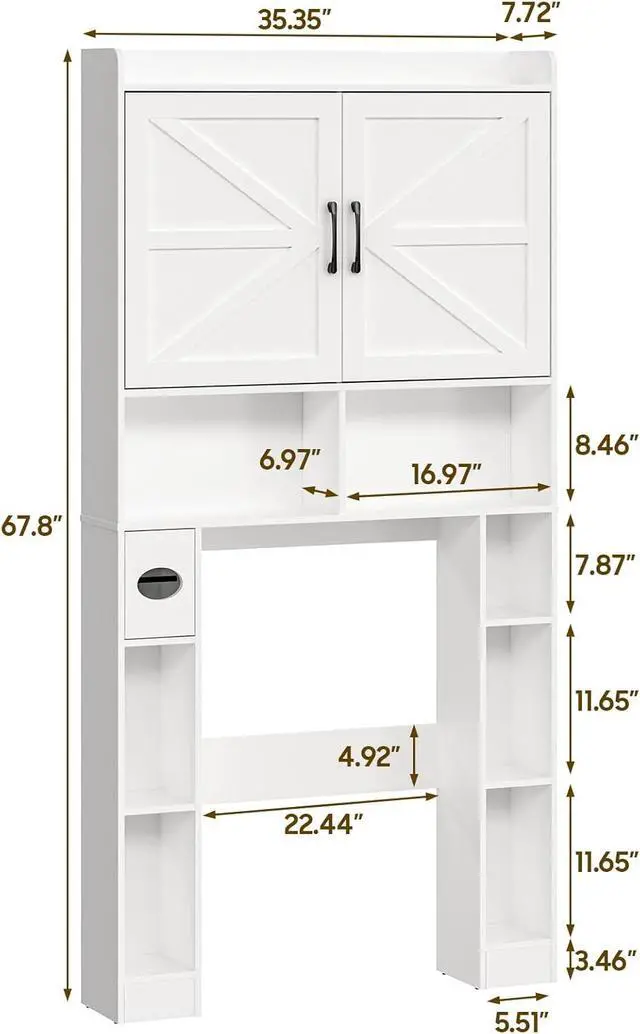 Customizable Storage SpaceThe unit comes with adjustable shelves that can be easily moved up, down, or removed entirely. The lower section has shelves on both sides, offering ample storage space for items of different sizes, allowing you to customize the space based on your specific storage needs and preferencesBathroom Storage Cabinet DimensionsMeasuring 67.8 inches x 35.15 inches x 7.72 inches, this over-the-toilet storage cabinet provides an efficient storage solution without overcrowding your bathroom. Please ensure the dimensions meet your specific requirements before purchasingEasy Assembly The assembly process of this sturdy piece is completed with simple step-by-step instructions.