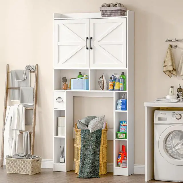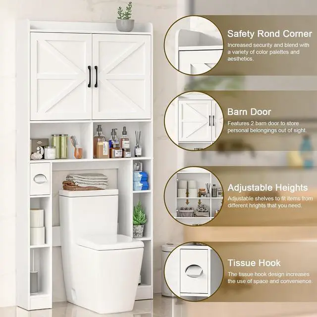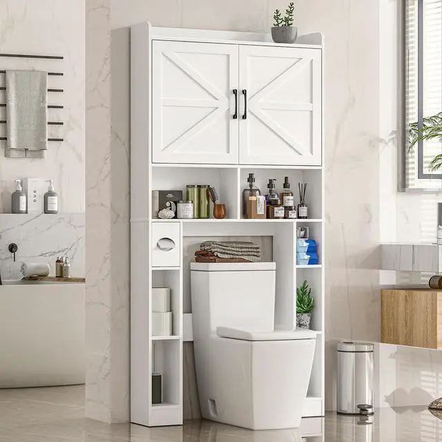 - Versatile Unique DesignThis above-the-toilet shelf features barn-door design for discreet storage of towels and toilet paper, along with open shelves for easy access to daily essentials. A specially designed vertical cabinet provides additional storage for paper rolls, keeping your bathroom organized and clutter-free.