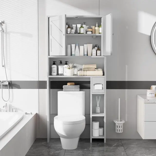 - Ample Storage Featuring 1 cabinet for hiding essentials out of sight, this over toilet cabinet also includes 1 open shelf on the top, 1 tissue holder box and 2 shelves at bottom for convenient access to everyday essentials. This bathroom storage cabinet will add extra storage space and make the small bathroom clean and tidy