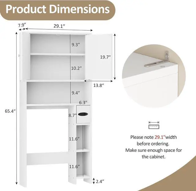 Vertical Space Saver The overall size of this over the toilet storage cabinet is 29.1" (W) x 7.9" (D) x 65.4" (H), suitable for most standard-height toilets with 31.9" height from the bottom board to the floor. Also equipped with 1 3-position adjustable shelf, this storage cabinet above toilet allows you to customize the space according to your need. The shelf can be easily moved up, down, or removedfalseSafe & Sturdy There are 2 anti-tipping devices to help anchor the shelf on the wall, which can ensure its safety and stability, and prevent danger.