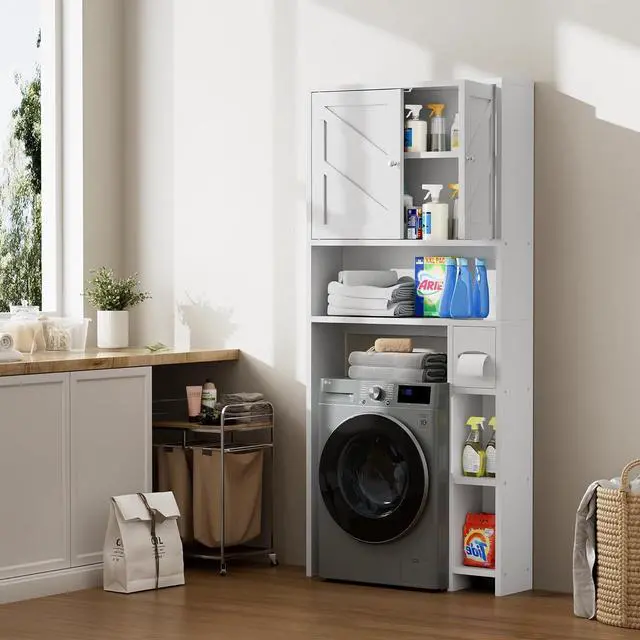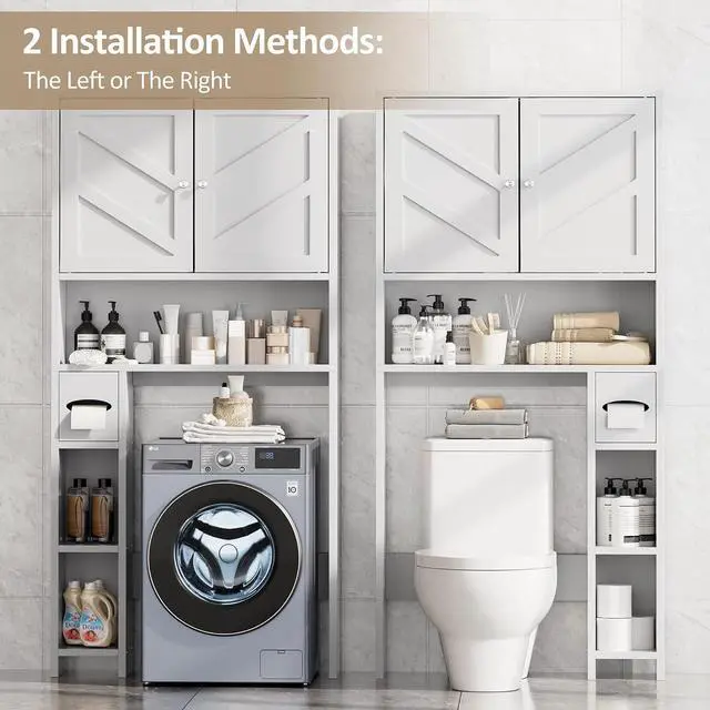 The bathroom storage organizer is also suitable for small washing machines. Please check the dimension before purchasingfalseEasy Assembly All parts, accessories and an instruction manual will be delivered in one package. Please note that some boards have different front and back sides when installing. Then just follow the step-by-step instruction. Please feel free to contact our customer service at first, if there is any question about product, logistics and installationfalse- Rustic Style This over the toilet storage cabinet is made of high-quality CARB P2-compliant wood, painted in a waterproof and moisture-proof process, in order to make your room neat and the cabinet sturdy for years.