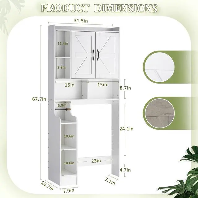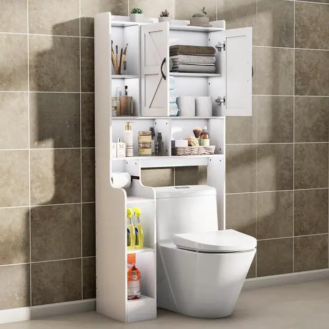 - Space-Saving SolutionThe side shelf is perfect for keeping your phone, keys, or small accessories handy while youre in the bathroom. Maximize your bathrooms vertical space with this freestanding over the toilet storage cabinet. Measuring 32 wide and 68 tall, it fits perfectly above most standard toilets without taking up valuable floor space.