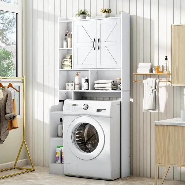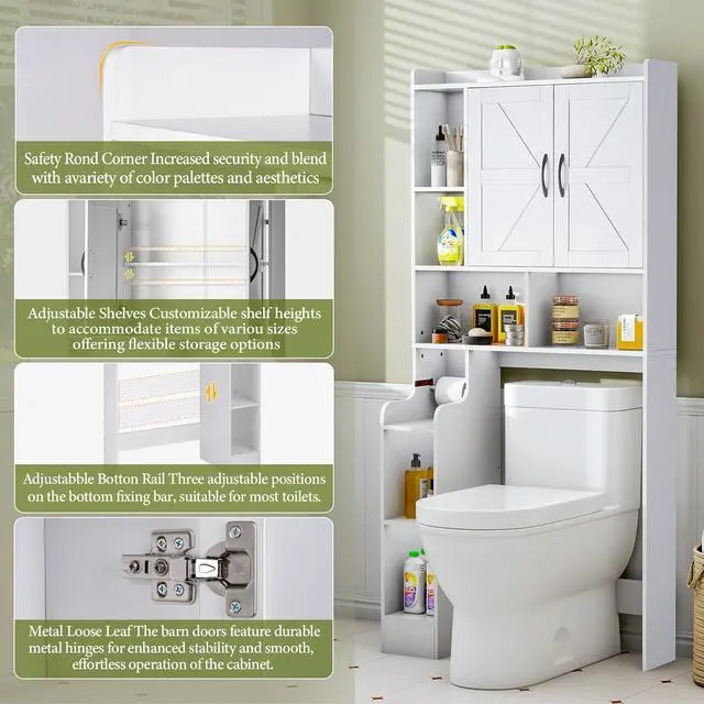 - Stylish & Functional DesignDesigned with a sleek grey finish and a modern farmhouse style, this bathroom cabinet over toilet storage complements any bathroom decor. The open shelves and side compartments offer easy access to your items while adding a touch of elegance to your space.