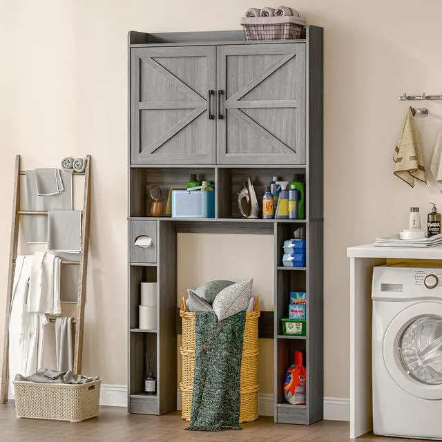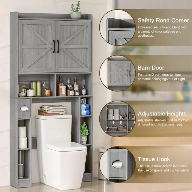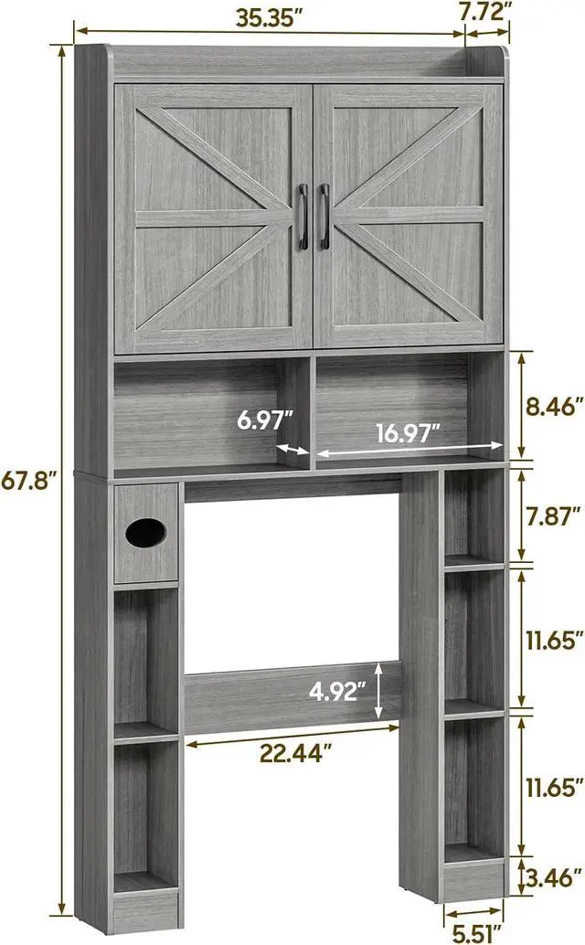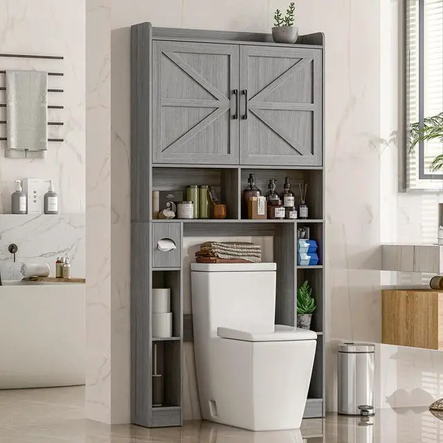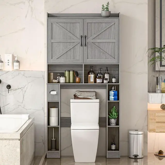 • Farmhouse StyleCrafted from premium engineered wood, our product effortlessly blends functionality with visual appeal, capturing the essence of farmhouse style. Its understated woodgrain finish adds a rustic charm to any room, while the adaptable design complements various color schemes and décor patterns. With its versatility, this product brings the enchanting essence of country farmhouse living into your homeVersatile Unique DesignThis above-the-toilet shelf features barn-door design for discreet storage of towels and toilet paper, along with open shelves for easy access to daily essentials. A specially designed vertical cabinet provides additional storage for paper rolls, keeping your bathroom organized and clutter-free