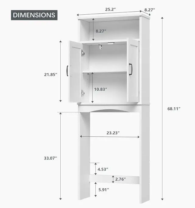 Its adaptable design makes it suitable for use in bathrooms, laundry roomsfalse- Maximizes Storage for Your Bathroom - This over toilet storage cabinet's stylish design maximizes vertical space above your toilet - doubling storage while complementing any décor. Measuring 25" x 8" x 68", daily essentials are within easy reach, utilizing typically unused wall space to organize your bathroom in a space-saving, aesthetically pleasing way