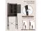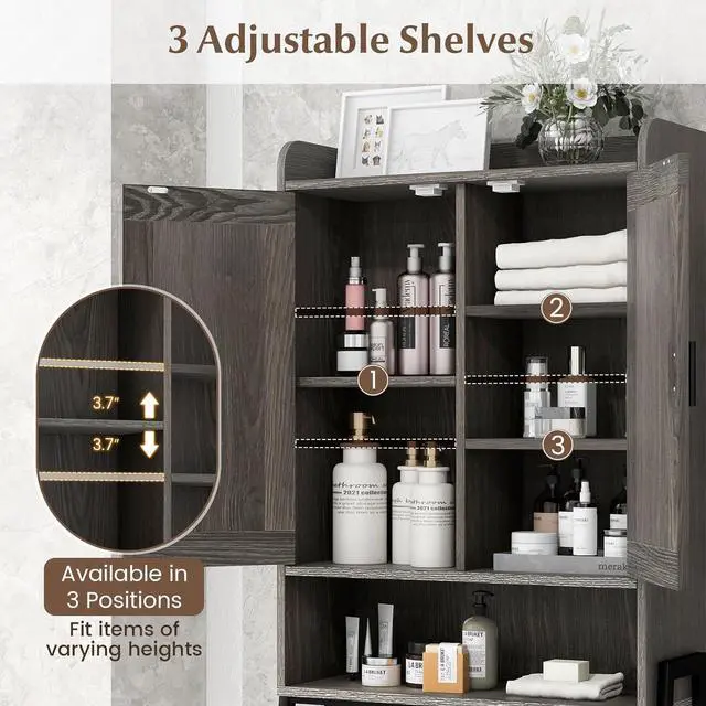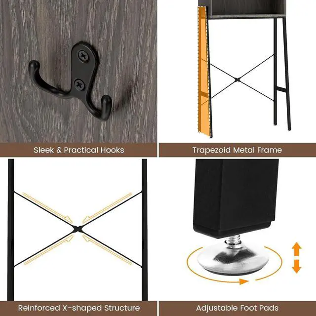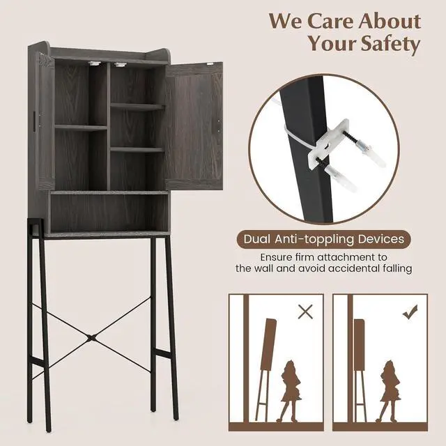 Roomy & Flexible Storage: This over the toilet storage cabinet includes a top with raised baffles, 5 compartments with doors, 2 sleek hooks and an open compartment. Besides, 3 adjustable shelves that are available in 3 positions can fit items of varying heights. Thus, you are able to organize a variety of bathroom necessities orderly. Overall dimension: 25" x 11.5" x 67"(L x W x H)Stable & Safe Construction: With anti-toppling devices, the freestanding bathroom organizer creates a safe using environment. Moreover, the heavy-duty metal frame with trapezoid structures and X-shaped construction ensures overall stability. While the adjustable foot pads adapt to uneven ground and protect the floor from scratches