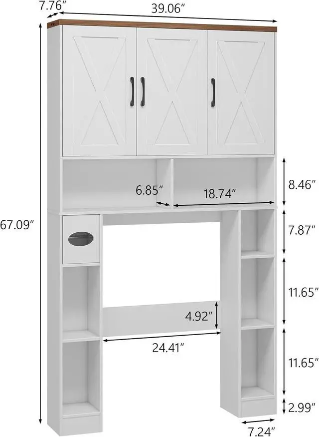 Customizable Storage SpaceThe unit comes with adjustable shelves that can be easily moved up, down, or removed entirely. The lower section has shelves on both sides, offering ample storage space for items of different sizes, allowing you to customize the space based on your specific storage needs and preferencesBathroom Storage Cabinet DimensionsMeasuring 67.8 inches x 35.15 inches x 7.72 inches, this over-the-toilet storage cabinet provides an efficient storage solution without overcrowding your bathroom. Please ensure the dimensions meet your specific requirements before purchasingEasy Assembly The assembly process of this sturdy piece is completed with simple step-by-step instructions.