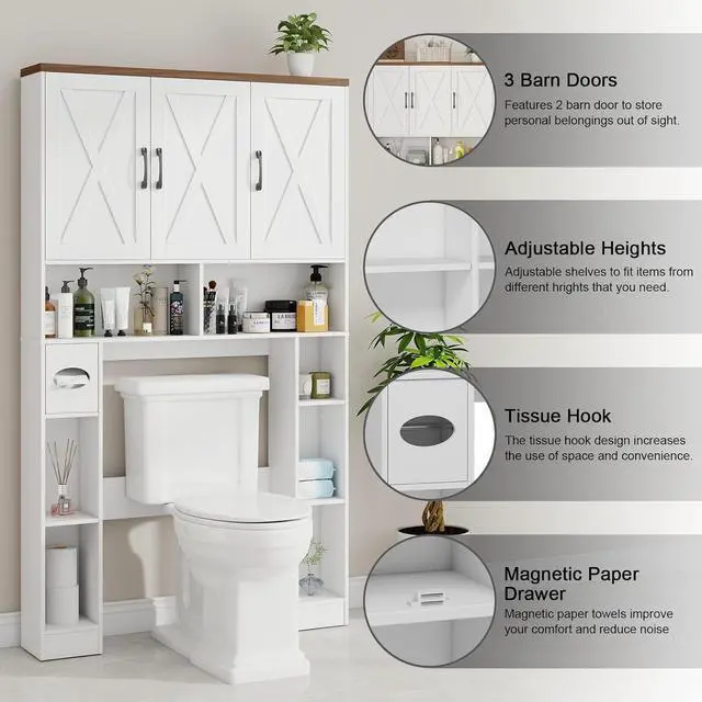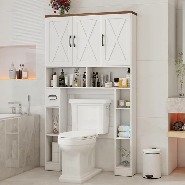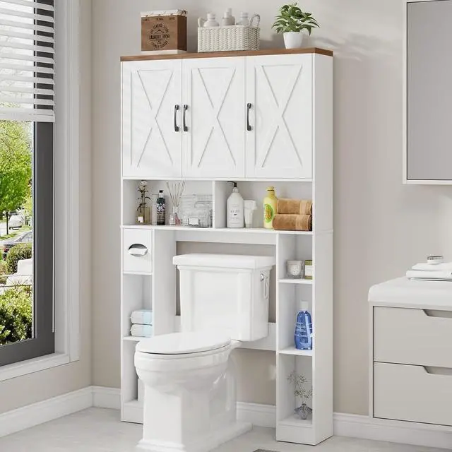 - Versatile Unique DesignThis above-the-toilet shelf features barn-door design for discreet storage of towels and toilet paper, along with open shelves for easy access to daily essentials. A specially designed vertical cabinet provides additional storage for paper rolls, keeping your bathroom organized and clutter-free.