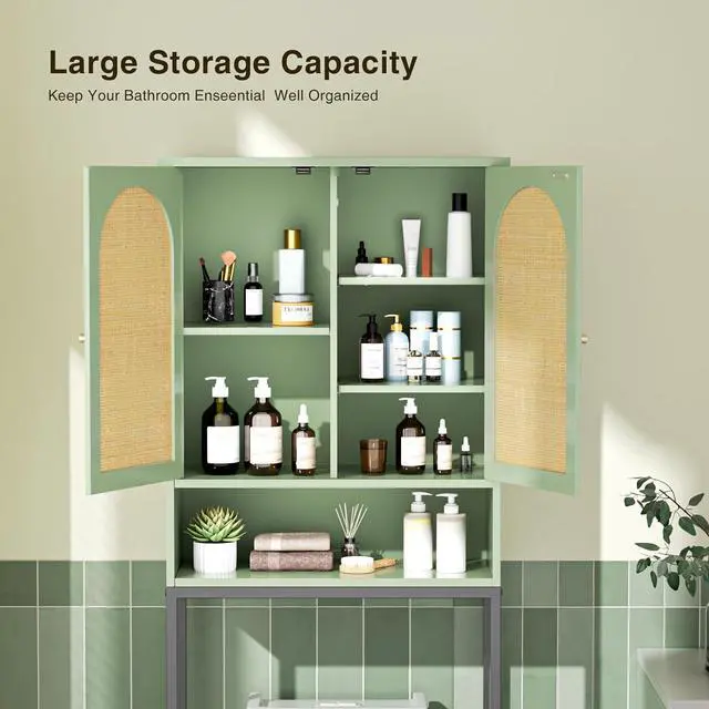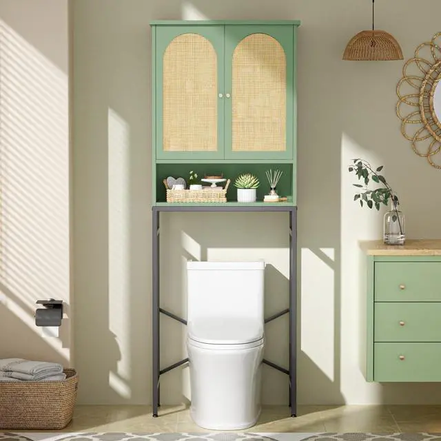 Space Saver Over The Toilet: It is a good way to solve the bathroom cluttered countertop. The cabinet with wood grain board and rattan double doors keep your accesaries storaged from exposing outside. You can choose between 3 shelf heights to suit various storage needs