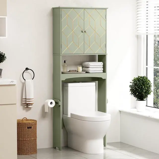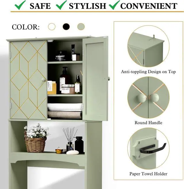 false- MODERN BATHROOM ORGANIZERModern and minimalist over the toilet storage cabinet with gold trim not only provides an elegant look, but also makes full use of the storage area above the toilet with paper towel holder, our toilet organizer is suitable for all styles of homes and can accommodate most standard toilets.