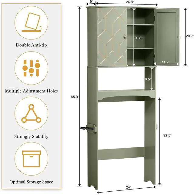 ADJUSTABLE SHELVESThe shelves inside the cabinet door have 7 position adjustment points, 2 shelves can be moved up and down according to your needs, you can choose to place only one shelf when you want to place high items, this bathroom organizer over the toilet is definitely the best choice for small apartments, small bathrooms and homes that need extra storage space for toilets and tidier laundry rooms. falseEASY TO ASSEMBLEWe come with detailed instructions and all the components of the over-the-toilet storage cabinet are numbered for easy assembly. If you have any questions or concerns, please don't hesitate to contact us and we will reply within 24 hours.
