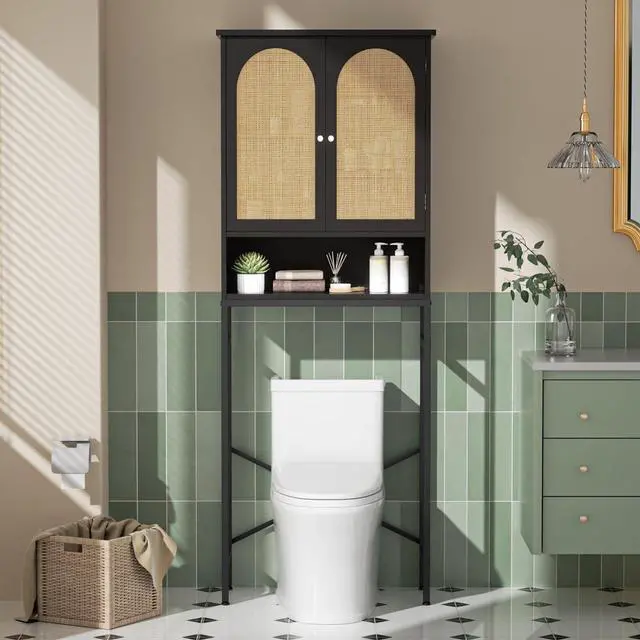 Toilet: Get tired of a clutted countertop? Not enough storage space for bathroom essentials? Our over toilet cabinet is designed to make suffient use of the space in bathroom. The cabinet with Wood grain board and rattan double doors keep your accesaries storaged from exposing outside, The shelf in the cabinet can be adjuated to different height according to your various storage needs.