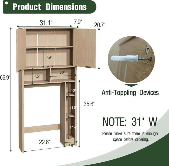 Install: We equip you with an anti-tipping device to fix this storage cabinet over toilet on the wall, and the instruction manual has detailed and clear steps that make it easy to install with two peoplefalse-
