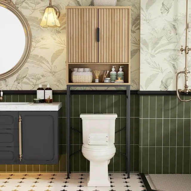 Functional Design: Combining a wooden cabinet with a black metal rack and fluted doors, this over-the-toilet storage unit exudes modern elegance while providing ample storage space for bathroom essentials