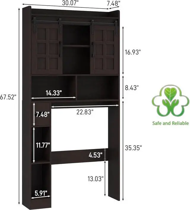 Flexible Storage SolutionsFitted with a 3-position adjustable shelf, this storage unit accommodates a variety of item sizes. The shelf can be effortlessly adjusted in height, repositioned, or even removed, giving you the flexibility to tailor the storage to your specific needs and preferencesSpace-Saving Bathroom OrganizerWith dimensions of 67" x 32" x 7.7", this over-the-toilet storage cabinet is an efficient solution that conserves space in your bathroom. Before purchasing, please verify that these dimensions are suitable for your bathroom to ensure a perfect fitSimplified Assembly ProcessPutting together this robust cabinet is straightforward, thanks to our clear, step-by-step assembly guide.