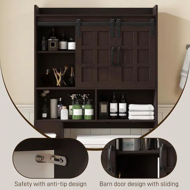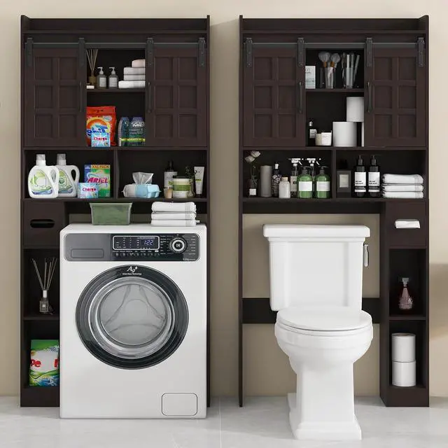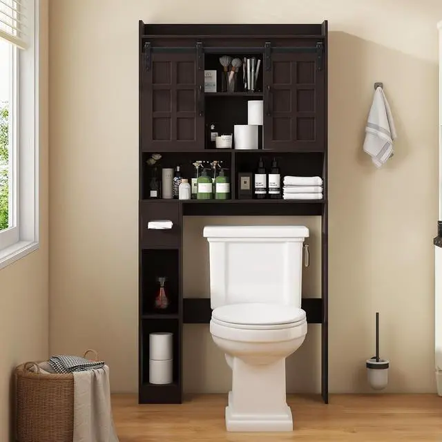 - Multi-functional Unique DesignThis over-the-toilet storage unit boasts two sliding doors that provide a subtle space for storing towels and toiletries. The open shelving offers easy access to frequently used items, while the uniquely designed vertical compartments are perfect for organizing extra rolls of toilet paper, maintaining a tidy and uncluttered bathroom.