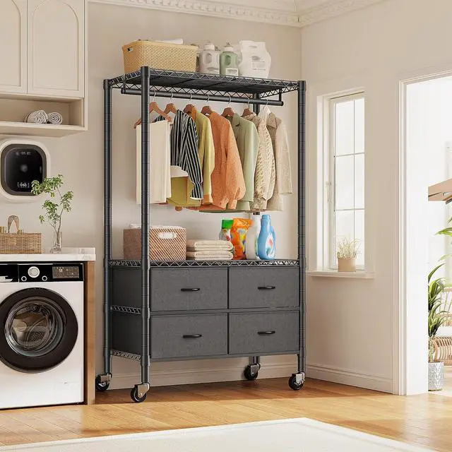 - Adjustable Shelves & Hanging RodsThe clothes rack is equipped with 1 garment rods, great for hanging suits, coats, pants, shirts or other heavy clothes. You can adjust the shelf upper or lower to match your clothes length. And 4 drawers for storage scarf, hat, bag, etcStay organized and efficientgreat for school, dorm, or home workspace
