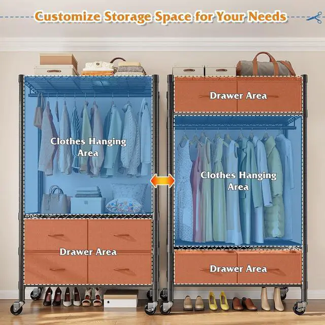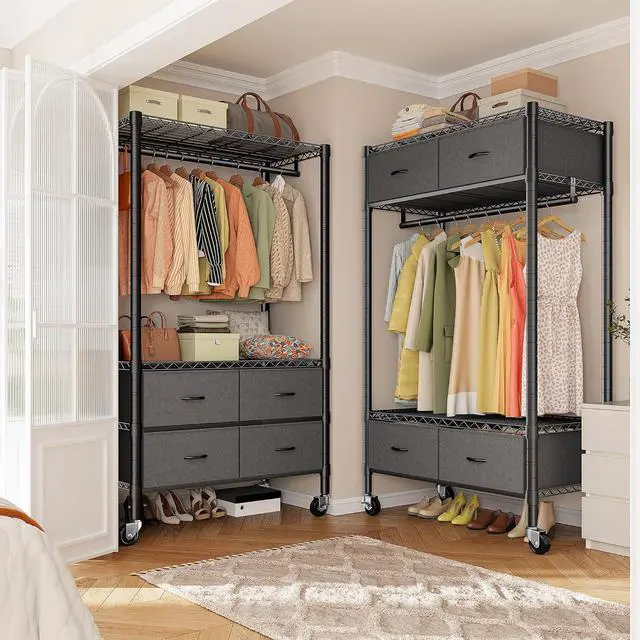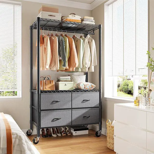 Adjustable Shelves & Hanging RodsThe clothes rack is equipped with 1 garment rods, great for hanging suits, coats, pants, shirts or other heavy clothes. You can adjust the shelf upper or lower to match your clothes length. And 4 drawers for storage scarf, hat, bag, etcStay organized and efficientgreat for school, dorm, or home workspacefalseMultifunctional Clothing Rack Heavy DutyBlack surface to protect it from water, makes it stable, sturdy and durable. Ideal for bedroom, cloakroom, clothing store, laundry room, studio, sewing area, walk-in closet and moreWheels Adjustable FeetA total of 4 adjustable feet are included, which protects your floor from scratches and make the free standing closet keep stable.