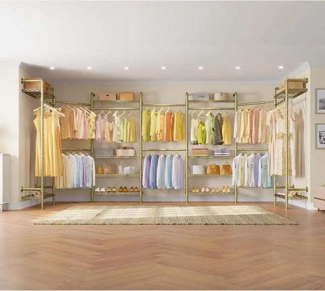 Multifunctional Storage Closet -- Closet mounted storage organization system can fit variety of you needs as an industrial wardrobe rack, hanging clothes rack, valet stand, coat stand, toilet rack bathroom shelf or wall hanger for clothes storage rack in the bedroom, laundry room, living room, retail store, washroom, bathroom. falseEasy to Assemble -- Our wall mount wire garment rack is easy to assemble with clear instruction step-by-step guide. You can easily install it without any help. false- Distinctive Style -- Modular closet systems consist of retro vintage industrial pipe clothing rack with 6 shelves, 5 closet rods (include 2 expandable hanging rods) and its modern simple look.
