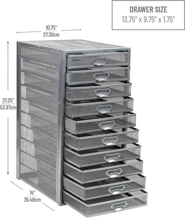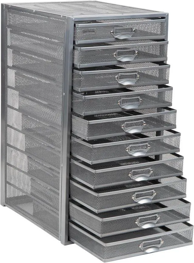 The durable metal mesh construction includes ten pull-out drawers for fast access to folders, stationery, or art materials. Use it as a desktop filing cabinet, craft storage unit, or mail sorterits compact footprint and lightweight frame make it easy to relocate as needed. Improve your organization and streamline your day with this efficient, multi-purpose organizer.