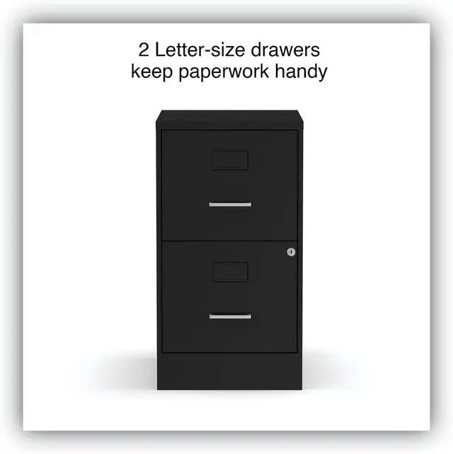 - Two-drawer light duty filing cabinet holds letter size documents.