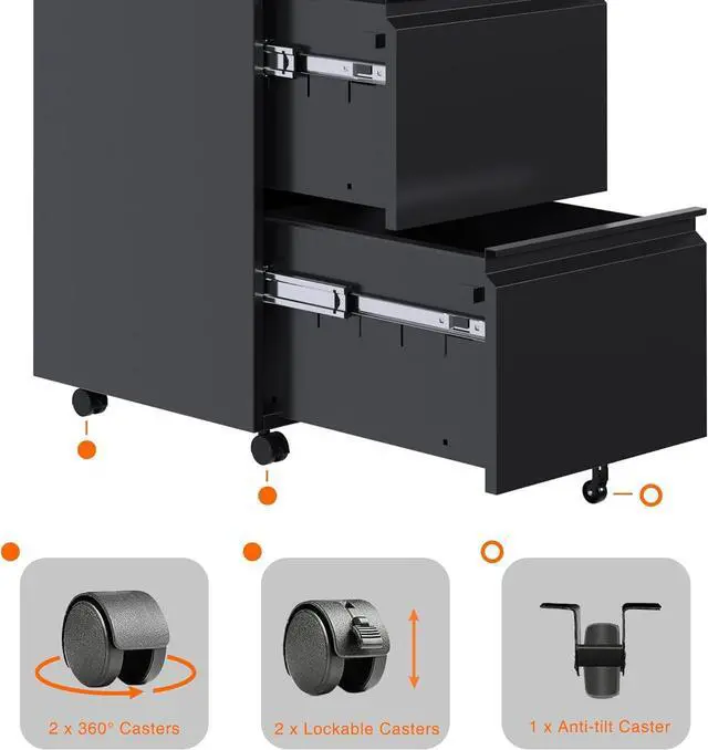 - ADD MORE MOBILITYThis 2 drawer file cabinet arrives with five casters, including two front casters with braking function and one center caster to prevent tipping