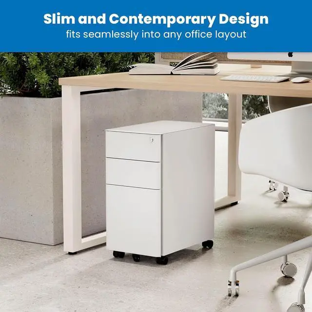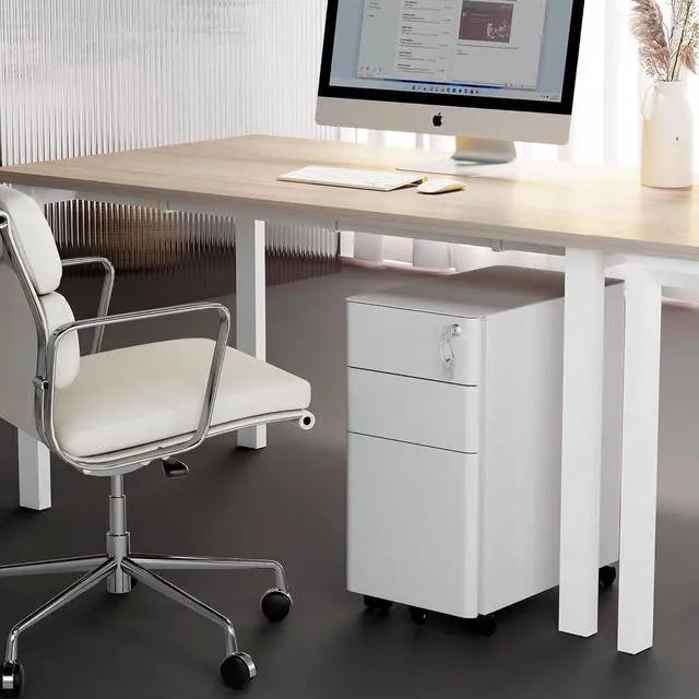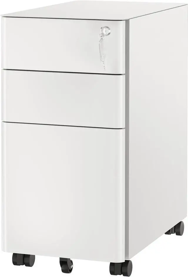 Convenience: Featuring four 360° swivel casters, this file cabinet can be easily moved around your office for maximum flexibility. The two front casters can be locked in place to keep the cabinet stable, while an additional anti-tipping wheel at the front prevents accidental tipping when drawers are opened. Whether you need to reposition it for cleaning or relocate it to another room, this file cabinet is designed to provide mobility without compromising on stability- Slim and