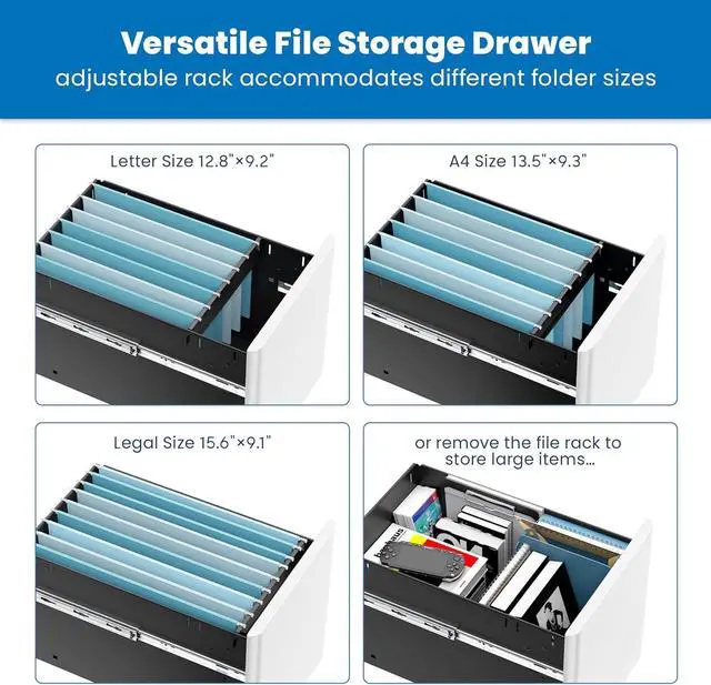 - Versatile Storage: With three spacious drawers, this cabinet offers ample storage for your office needs, accommodating letter, legal, and A4 size folders with ease. The top drawer includes an adjustable pencil tray, providing convenient access to writing utensils and smaller office supplies. This versatile design helps you stay organized by keeping important documents and supplies neatly stored and easily accessible.