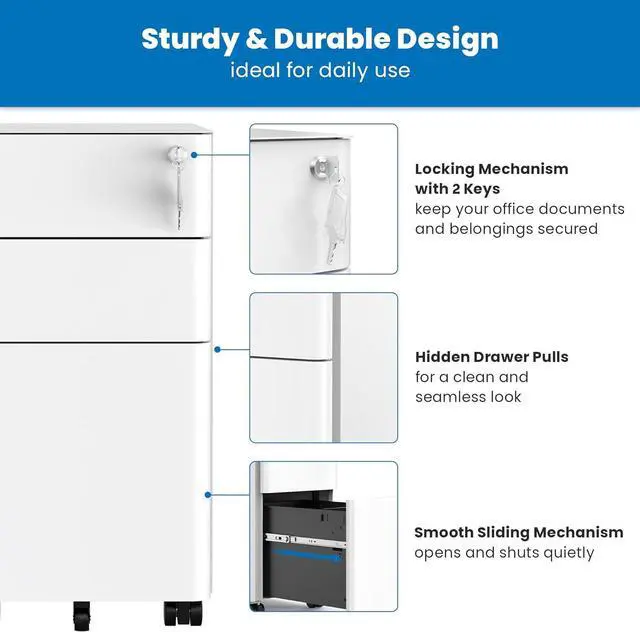 & Secure: Crafted from high-quality steel, this file cabinet is built to withstand the rigors of daily use while maintaining a polished, professional look. The built-in lock provides added security, ensuring that your confidential documents and valuable items are kept safe from unauthorized access. With its sturdy construction and reliable locking mechanism, you can trust this cabinet to safeguard your important belongingsMobile