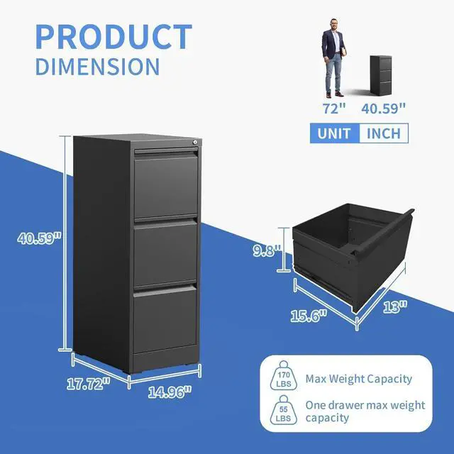 Anti-tilt DesignThis vertical legal file cabinet designed with full extension and steel ball-bearing suspension, all drawers of the file cabinets can be opened and closed quietly and easily. The anti-tilt system ensures that only one drawer can be open at a time, preventing the metal file cabinet from tipping over. You can have peace of mind knowing that your important documents and items are safe and secureMultiple Storage TypesThis 3 drawer of the metal cabinet for home office is larger and deeper than similar cabinets in the market. Making it the perfect solution for all your storage needs.