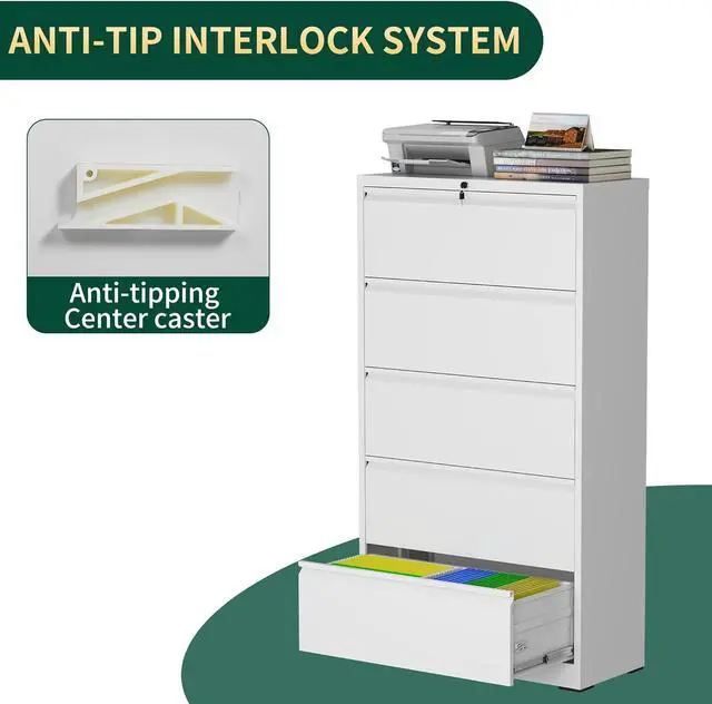 Ample Storage SpaceThe 5 drawer lateral file cabinet with lock is larger and deeper than similar file cabinets. The bottom file drawer is equipped with a removable hanging bar, allowing you to perfectly store letters, legal, A4 size folders and file box, making it the perfect solution for all your storage needsPrivacy Security and Anti-tilt DesignThe interlock system secures the 5 drawers and comes with two keys to protect your files. The anti-tilt system ensures that only one drawer can be open at a time, preventing the metal file cabinet from tipping over.