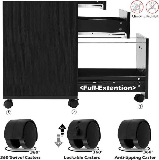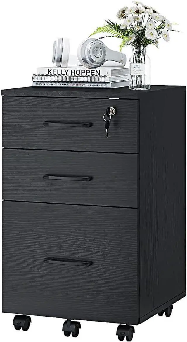 3 Drawer Wood Mobile File Cabinet, Under Desk Storage Drawers Small File Cabinet for Home Office (Black)