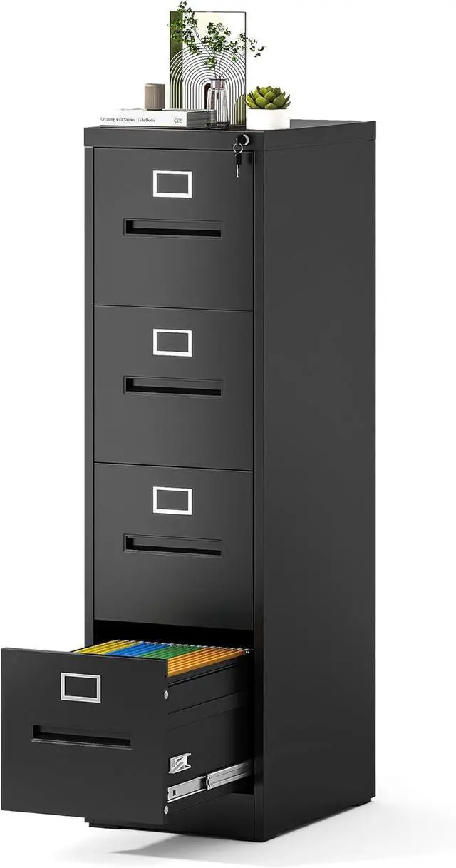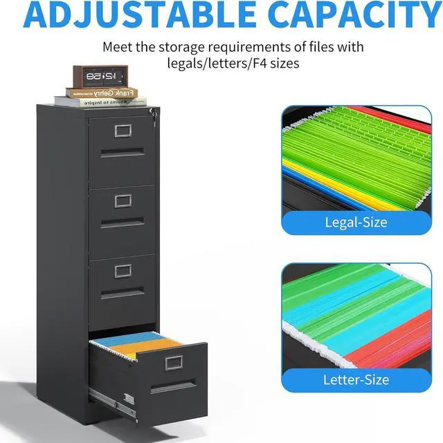 Anti-tilt DesignThis black 4 drawer filing cabinet designed with full extension and steel ball-bearing suspension, all drawers of the file cabinets can be opened and closed quietly and easily. The anti-tilt system ensures that only one drawer can be open at a time, preventing the metal file cabinet from tipping over. You can have peace of mind knowing that your important documents and items are safe and securefalseMultiple Storage TypesThis 4 drawer metal file cabinet for home office is larger and deeper than similar cabinets in the market. Making it the perfect solution for all your storage needs.