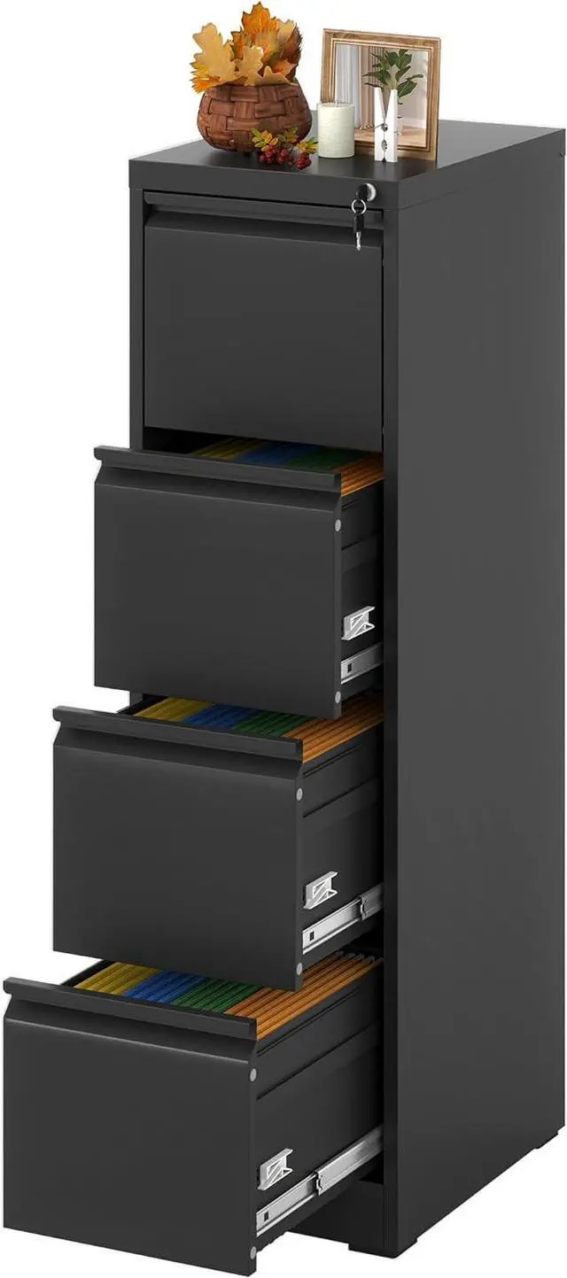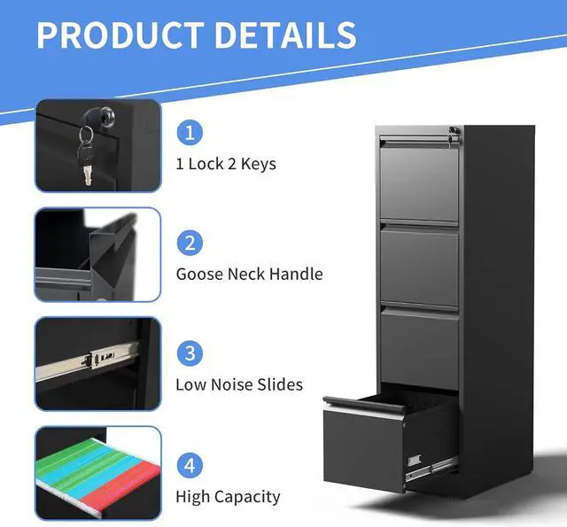 Anti-tilt DesignThis filing cabinet 4 drawer designed with full extension and steel ball-bearing suspension, all drawers of the file cabinets can be opened and closed quietly and easily. The anti-tilt system ensures that only one drawer can be open at a time, preventing the metal file cabinet from tipping over. You can have peace of mind knowing that your important documents and items are safe and secureMultiple Storage TypesThis 4 drawer vertical file cabinet for home office is larger and deeper than similar cabinets in the market. Making it the perfect solution for all your storage needs.