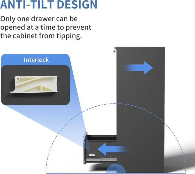 - Anti-tilt DesignThis filing cabinet 4 drawer designed with full extension and steel ball-bearing suspension, all drawers of the file cabinets can be opened and closed quietly and easily. The anti-tilt system ensures that only one drawer can be open at a time, preventing the metal file cabinet from tipping over. You can have peace of mind knowing that your important documents and items are safe and secure.