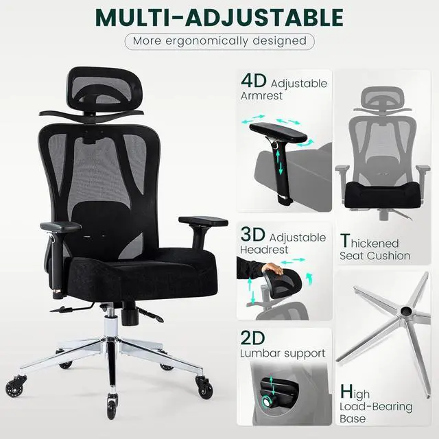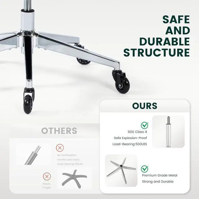 Premium MaterialsConstructed with high-quality breathable mesh for ventilation and a sturdy aluminum alloy base for stability, this chair is made to endure. It features quiet, smooth-rolling rubber wheels and an SGS-certified 4-stage gas lift for reliable performance and safety. falseQuality AssuranceCertified by SGS and BIFMA, this ergonomic office chair is built to exceed industry standards for safety and durability. With a 1-year warranty and exceptional customer support, you can buy with confidence and transform your workspace with this advanced seating solution. false- Comfort for UsersThis heavy-duty ergonomic office chair is designed to support individuals up to 500 LBS, ensuring durability and comfort.