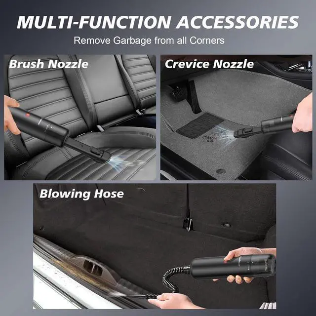 MULTIPLE USES: This cordless rechargeable car vacuum cleaner comes with a 3-in-1 accessory for better adsorption of those hard-to-reach crevices for all-around treatment. Similar to car backseats, sofa crevices, corners, floors, kitchens and mo