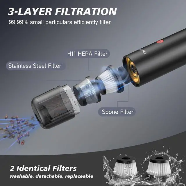 HEPA FILTERS & TRIPLE FILTERS: We provide 2 HEPA filters for you to change at any time. This handheld vacuum cleaner comes with three layers of removable, washable, and reusable filters, including a metal filter, H11 HEPA filter, and a sponge filter, which filters out 99.99 % of dust and protects the motor from damage caused by fine particles.