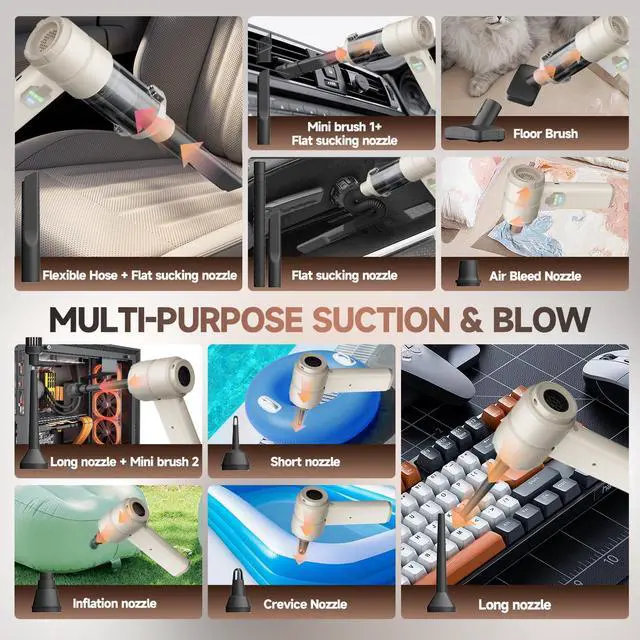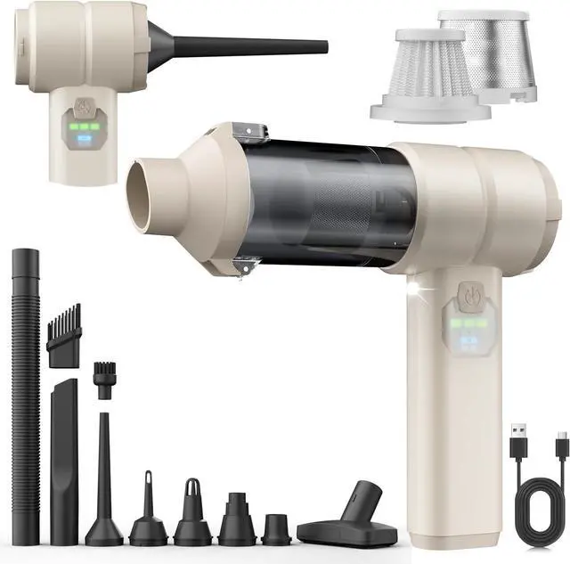 LED Display & Lightweight and PortableThis mini car vacuum cleaner weighs only 450 grams, so you can hold it in one hand for a long time without feeling tired. It can be easily stored anywhere in your home or car. It is equipped with a display that can show the gear position and remaining power in real time, so you can easily grasp the wind speed and charge the vacuum cleaner in time even in the dark night. In addition, it also comes with an LED light, which can illuminate hard-to-reach corners and gaps, and can also be used as an emergency flashlight.