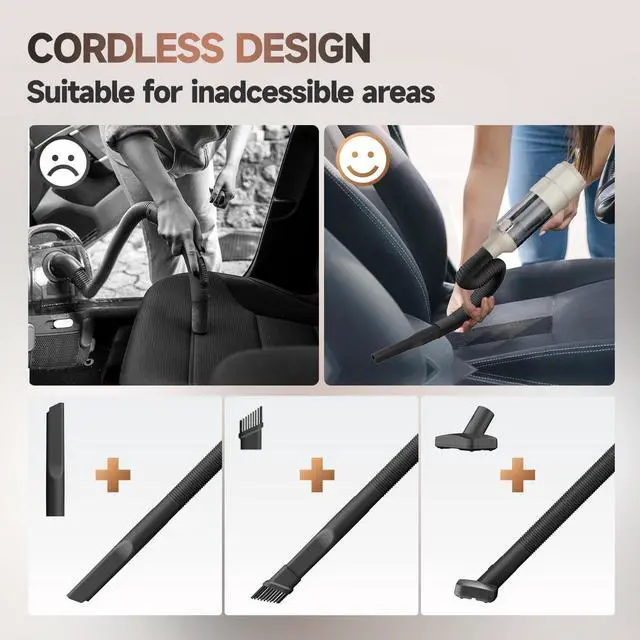 Notice: Please fully charge the vacuum for car before use. When mini vacuum cleaner cordless is on low power, the suction may decrease. The filters is a washable and replaceable accessory which need to be cleaned in time, otherwise it will affect the suction of the machine.