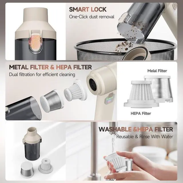 Dual Filtration System & one-click to EmptyCar vacuum portable cordless cleaner comes with an upgraded dual filtration system. The HEPA filter fine dust during use and can be easily washed and reused. Metal filters effectively filter out large particles of debris to prevent damage to the cordless handheld vacuum. One-click dust removal design, just one click, the garbage can be emptied smoothly without dirty hands.