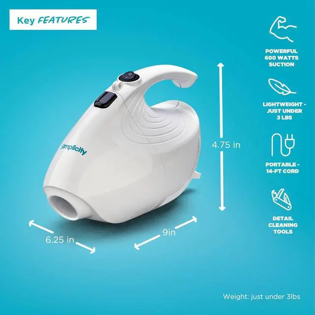 Impress your mess! The Simplicity F1 Flash Handheld Vacuum makes cleaning everyday small messes fast and easy. Use it in your car, sewing machine, pantry, pet areas, on your upholstery or anywhere mini messes hide. At 600 watts of power, craft and sewing machine messes don't stand a chance. Pet hair, dry spills, dust and debris are obliterated with powerful suction from this compact vacuum.