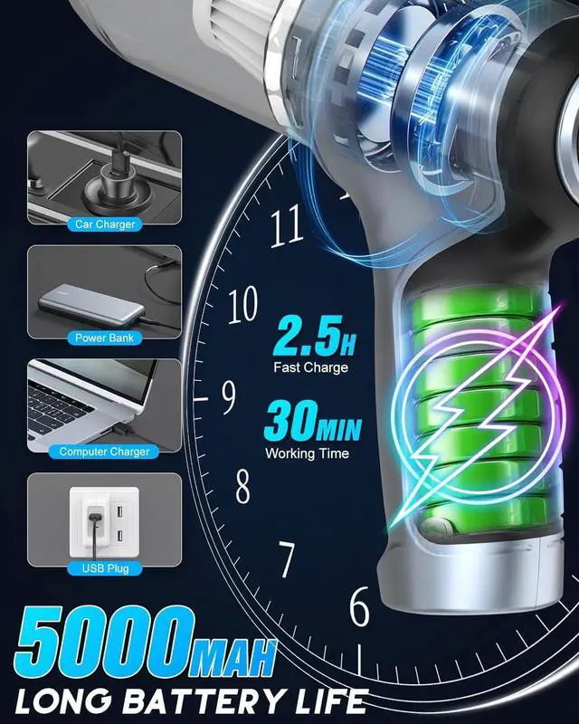 - -- Equipped with a 5000mAh rechargeable battery, our vacuum cleaner provides up to 30 minutes of uninterrupted cleaning. You can thoroughly clean your vehicle without worrying about car vacuum's battery life and the included charging cable ensures quick and easy recharging