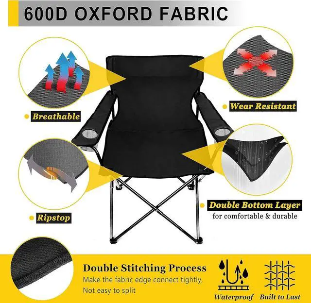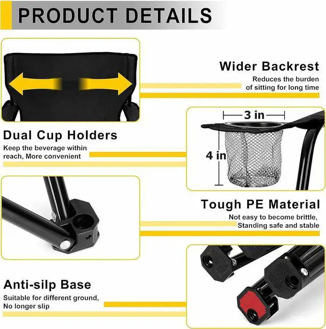 CONVENIENT & COMFORTABLE Our portable folding chairs combine ergonomic designs with convenient features, The 21in wider backrest supports your back better, With a seat height of 19in and depth of 18.3 in, Let your body be completely relaxed, And long armrests at the proper height get you in greater comfort, Dual mesh cup holders keep your favorite beverages and snacks within easy reach